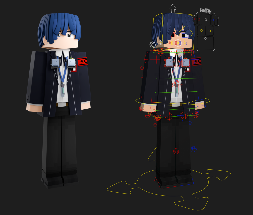 A character rig based on the Persona 3 character Makoto Yuki but in the Minecraft style made for Blender.